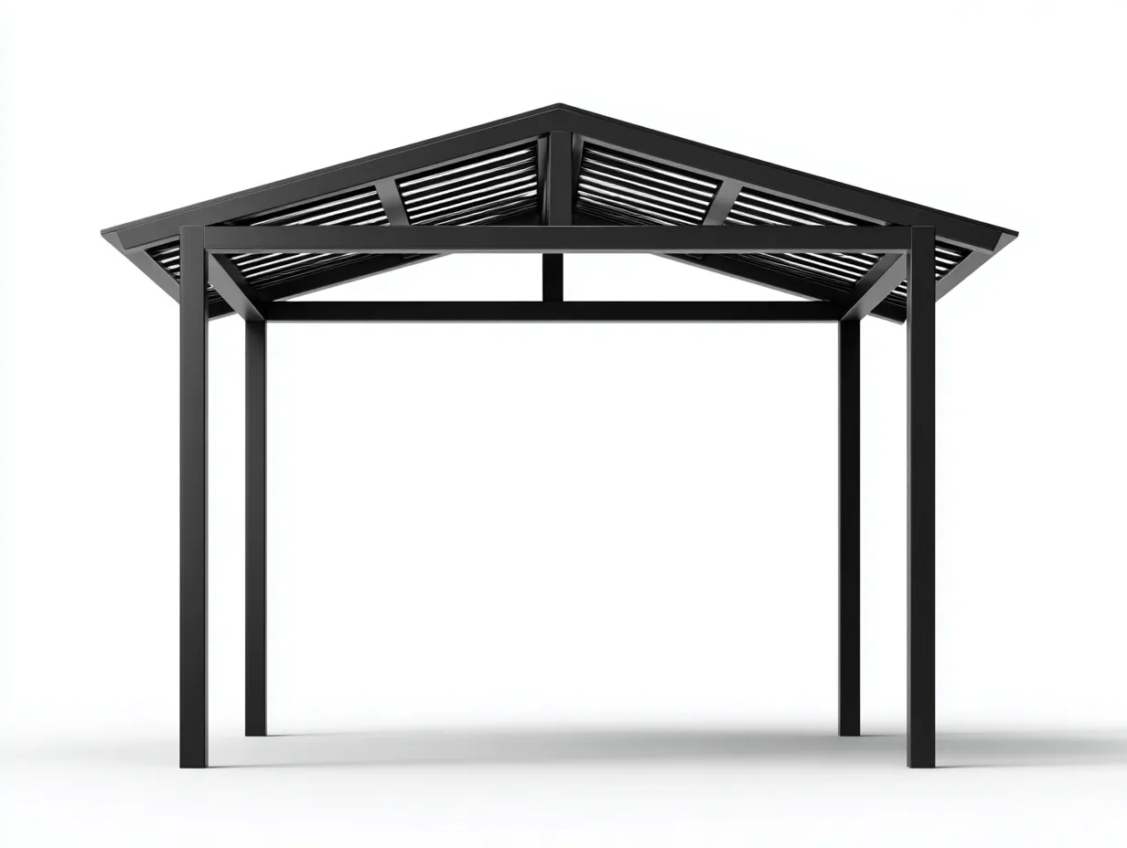 La structure est fabriquée en aluminium avec une finition noire homogène. Le toit est composé de lames métalliques intégrées, adaptées à une exposition extérieure prolongée et offrant une bonne stabilité structurelle.