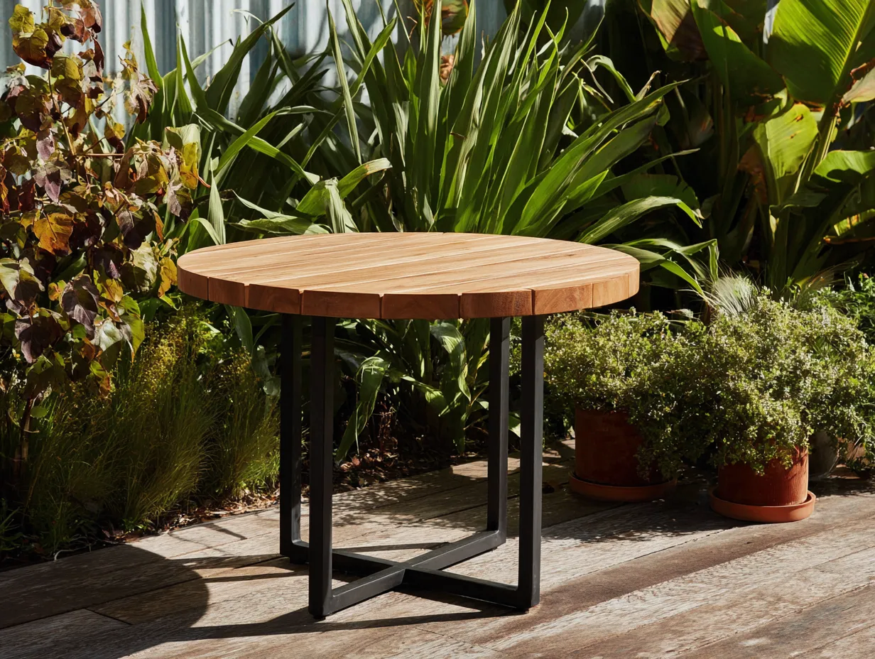 Le plateau est fabriqué en bois de couleur marron avec une finition naturelle. La structure est réalisée en métal noir, assurant une bonne stabilité et une intégration harmonieuse dans un environnement extérieur.